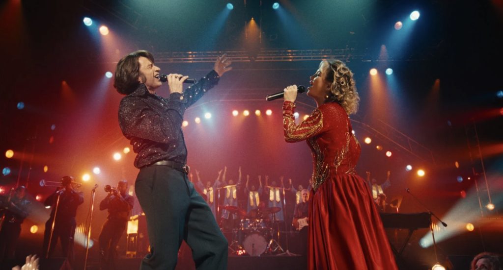 Années 80, brushing improbables, costumes de boule à facettes et musique de Neil Diamond, tel était le programme annoncé par Sur un air de Blues. Un programme qui va vite se resserrer autour d’un mélange de mélodies à la Sweet Caroline, de romance cheezy et de tragédie bouleversante. L’histoire de Lightning & Thunder est finalement assez simple et universelle : elle incarne les rêves de malchanceux qui ont tenté d’entreprendre quelque chose, qui ont affronté les aléas et le cynisme de la vie, mais qui se sont battus contre vents et marées pour y arriver et tenter de laisser une trace. Le film de Craig Brewer est très didactique, très programmatique surtout. On sent venir de très loin les étapes qui vont jalonner les grandes lignes de son scénario, au moins autant que l’on sent la méthodologie derrière la production. Faire une reconstitution soignée, y planter des personnages attachants, puis faire sourire et pleurer l’audience entre deux airs de musique connus que l’on va tous fredonner… Enfin « tous », tous ceux qui connaissent un peu Neil Diamond disons. C’est probablement l’une des limites du film chez nous. Légende aux Etats Unis, Neil Diamond l’est un peu moins auprès du grand public hexagonal (voire européen). De fait, Sur un air de Blues n’aura probablement pas le même impact qu’outre-Atlantique où son capital nostalgie marchera à fond les micros. Néanmoins, au-delà de la revisite du répertoire de l’artiste, c’est surtout le mélodrame qui va faire fonctionner le film. Dans un mélange d’efficacité et d’ultra-conventionnalisme, Brewer déroule l’histoire émouvante de Lightning & Thunder en capitalisant sur les excellentes prestations de son duo de stars. Et roule ma poule en direction des Oscars où Sur un air de Blues a tout du biopic taillé pour briller.