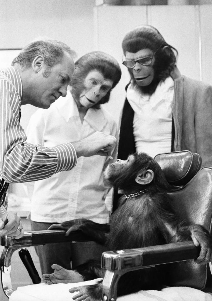 LES EVADES DE LA PLANETE DES SINGES de Don Taylor (1971) : Réunion de vrais et faux singes.