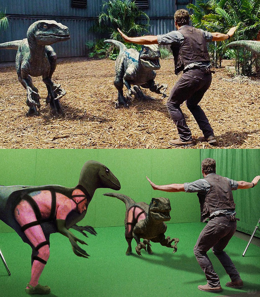 JURASSIC WORLD de Colin Trevorrow (2015) : Avec et sans les effets spéciaux. Une pensée pour ces pauvres gars courbés à poil dans un costume de raptor miteux.