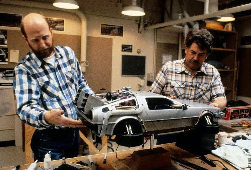 RETOUR VERS LE FUTUR 2 de Robert Zemeckis (1989) : La maquette de la Delorean sur le tournage.