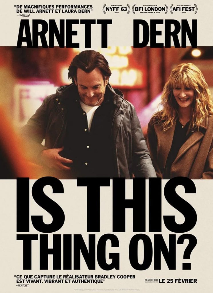 Formidablement interprété par un Will Artnet très investi dans son personnage et une Laura Dern excellente en ex-épouse toute aussi déboussolée que lui, Is This Thing On ? affiche son meilleur visage quand il vient s’approcher du détail. Comme ce moment durant un banal brossage de dents où le couple réalise que c’est fini, que le temps a fait son œuvre. Comme cette complicité presque retrouvée quand le poids de la vie conjugale s’est envolé. Malheureusement, le film de Bradley Cooper est trop inégal pour convaincre pleinement. Si le film distille son lot de scènes magnifiques captées sans fard avec justesse et sensibilité, l’ensemble manque cruellement de constance, entre autres choses. À commencer par toute une longue première partie à laquelle on peine à accrocher tant la triste banalité de ce qui nous est conté manque d’une dimension narrative justifiant l’intérêt de nous raconter précisément cette histoire là. Peut-être est-ce un problème de regard, ou tout simplement que Cooper assume l’idée d’une simple chronique de vie précisément sans originalité. En parlant d’originalité, que ce soit l’histoire dans sa globalité ou la mise en scène arty faisant le choix d’une fausse épure (cadrages serrés, longs plans, caméra à l’épaule), Is This Thing On ? donne trop souvent l’impression d’avoir déjà vu ça, en mieux ailleurs. D’autant qu’il s’en dégage une forme de grande naïveté au final.