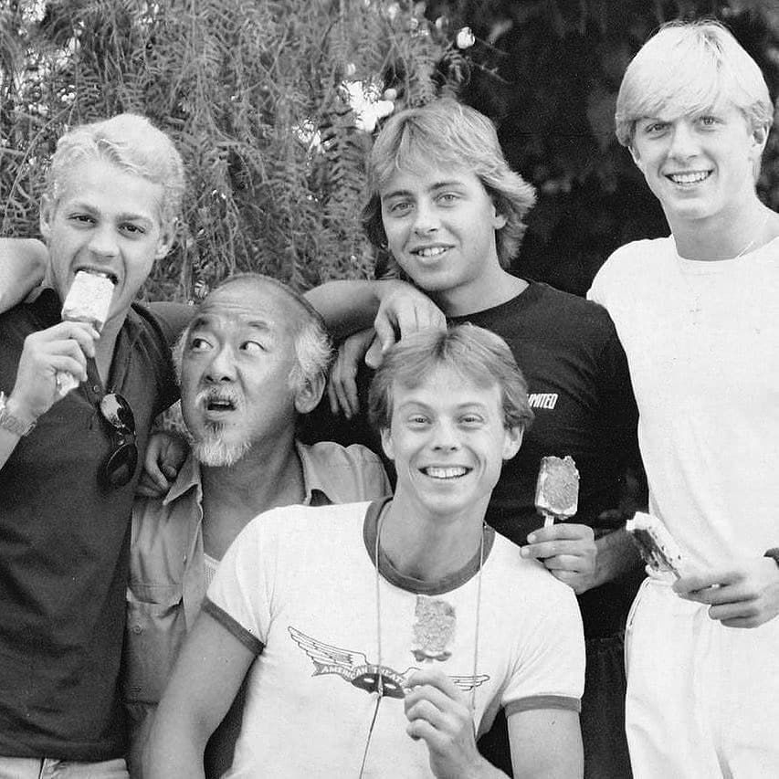 KARATE KID de John G. Avildsen (1984) : Pat Morita et la bande du Cobra Kai.