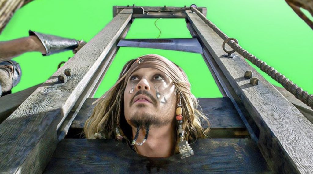 PIRATES DES CARAIBES 5 de Joachim Rønning & Espen Sandberg (2017) : La tête de Johnny Depp sur fond vert.