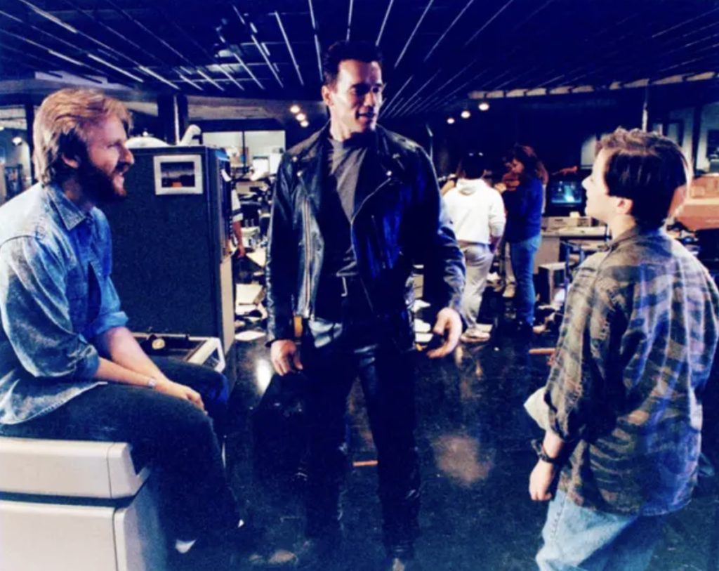 TERMINATOR 2 de James Cameron (1991) : Schwarzy, Edward Furlong et James Cameron sur le tournage.