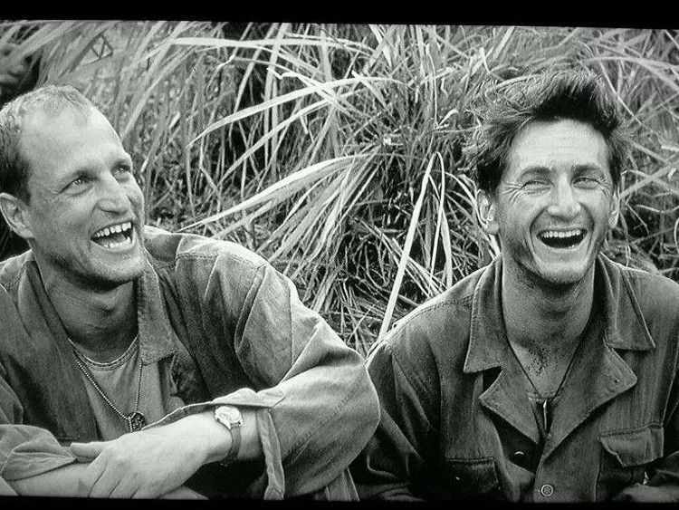 LA LIGNE ROUGE de Terrence Malick (1998) : Woody Harrelson et Sean Penn hilares sur le tournage.