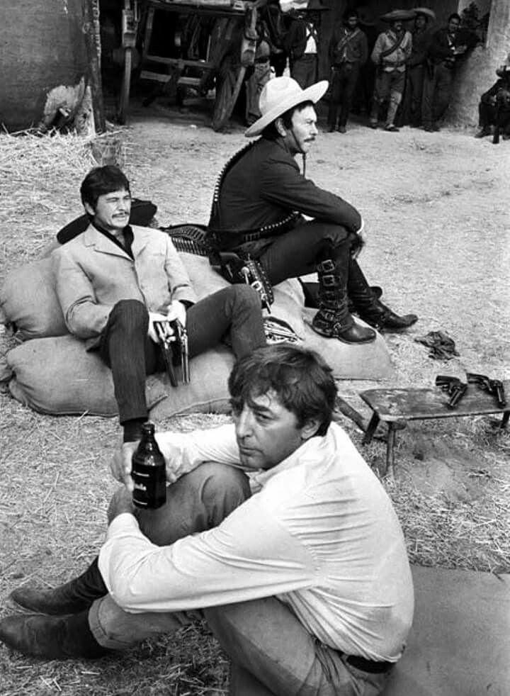 PANCHO VILLA de Buzz Kulik (1968) : Le trio Robert Mitchum, Charles Bronson et Yul Brynner sur le tournage.
